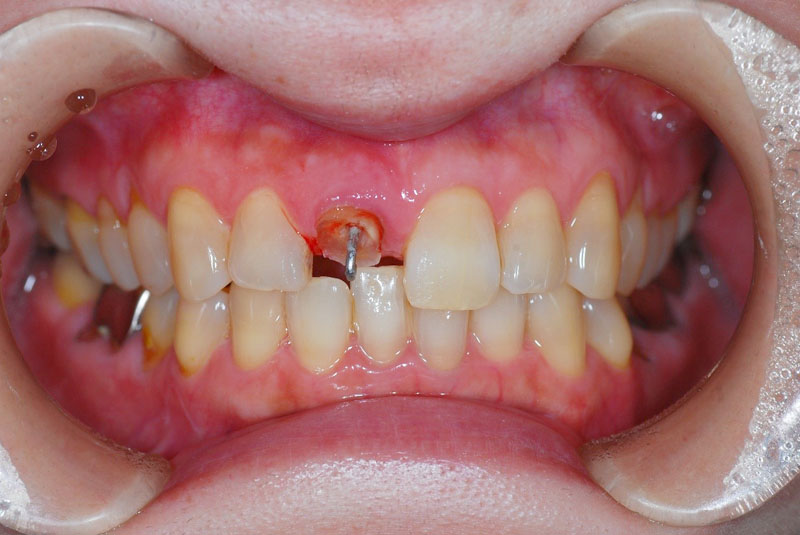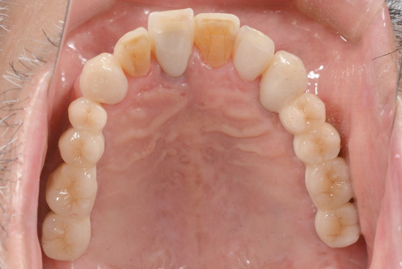 - 両側の歯を削りたくないのでインプラント治療を希望された患者さんです。前歯部インプラントの難易度はずばり審美性です。前歯なのでできる限り隣の歯と合わせる必要があります。特に1本欠損で両側が天然歯というのは難易度の高い症例です。この患者さんは決断が早く、歯槽骨まで感染が及んでいなかったため抜歯と同時のインプラント埋入を行うことで骨移植等を行うことなく治療可能でした。前歯は場合によっては審美性を確保するために歯肉移植が必要なことも多く、当院では歯肉移植を行うかどうかは患者さんと相談させていただいております。