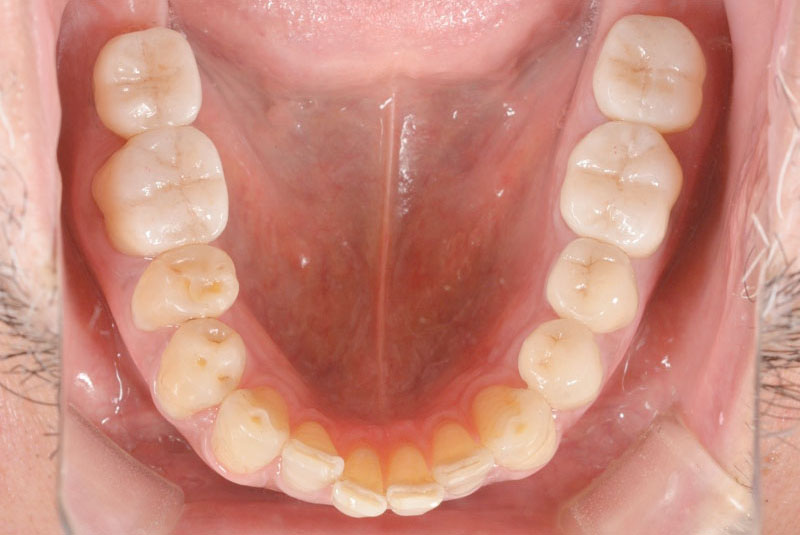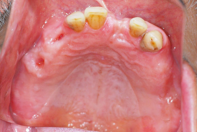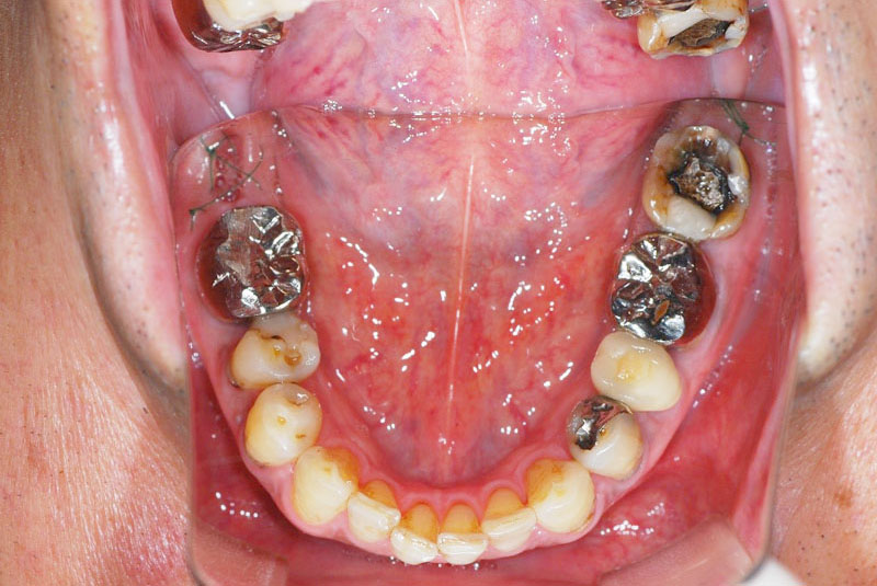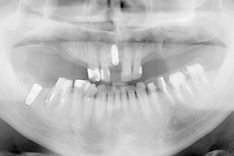 - 前医にて上顎部分入れ歯を装着、下顎の奥歯を抜歯した状態で来院されました。また下顎の両側の臼歯の抜歯が必要と診断されたとのことでした。前医にインプラントを相談したが下顎はできるが、上顎は骨がないことを理由にインプラント不可能と診断され当院受診されました。診断の結果、下顎臼歯は保存可能、上顎臼歯部は左右上顎洞に対する骨造成(サイナスリフト)、前歯部はGBRにて骨造成を行い、インプラント埋入を行いました。